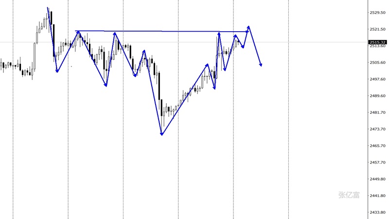 黄金周线收录一根阳线十字星,那么本周就是要观察是继续收强阳,还是出现承压回撤,后者将转震荡。日线,短暂的调整后支撑突破2470区域,后市该水平将出现有效的支撑位水平。四小时,经过三波下跌调整后企稳上涨通道下线,慢阳走高放量,随着次高点2520被站稳,那么四小时应该还有一波冲高后才能进入震荡。根据今日走势上看,黄金处于高位调整中,下方2500下破之后,金价将有望去考验2474一带支撑。综合以上分析,张亿富认为:黄金处于区间徘徊中,操作上考验回撤布局多单为主,高空为辅,上方关注2526-2532美元阻力,下方关注2508-2500美元支撑。今日黄金实盘在2521-2525布局空单,获利在2510一带。
