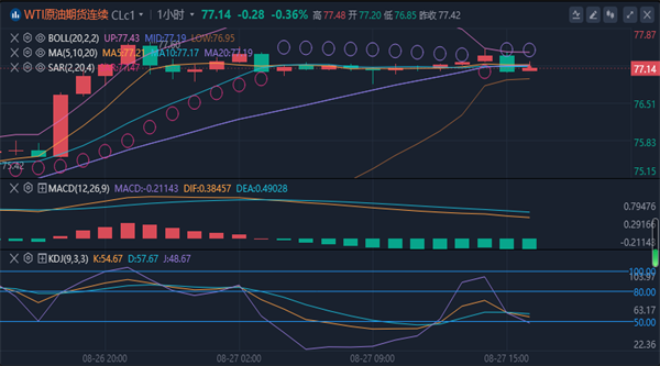 【原油消息面分析】:周二(8月27日)过去三天大幅上涨后。布伦特原油期货价格在北京时间15:53时交投于80.12美元/桶,日内下跌0.23美元,跌幅0.29%。与此同时,西德克萨斯中质油(WTI)原油期货报77.15美元/桶,日内下跌0.27美元,跌幅0.37%。