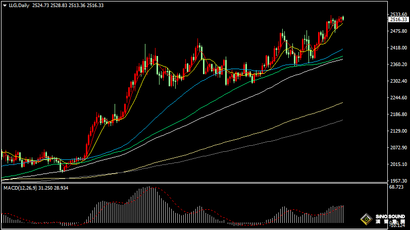 黄金日线图看,今日早盘金价延续昨晚上涨态势,金价冲高至2528美元再度遇阻回落,显示金价逼近2530关口附近存在一定阻力压制。日线指标看,5日与10日均线维持多头排列,MACD指标正动能柱相对持续,RSI指标持续在62位置附近徘徊。