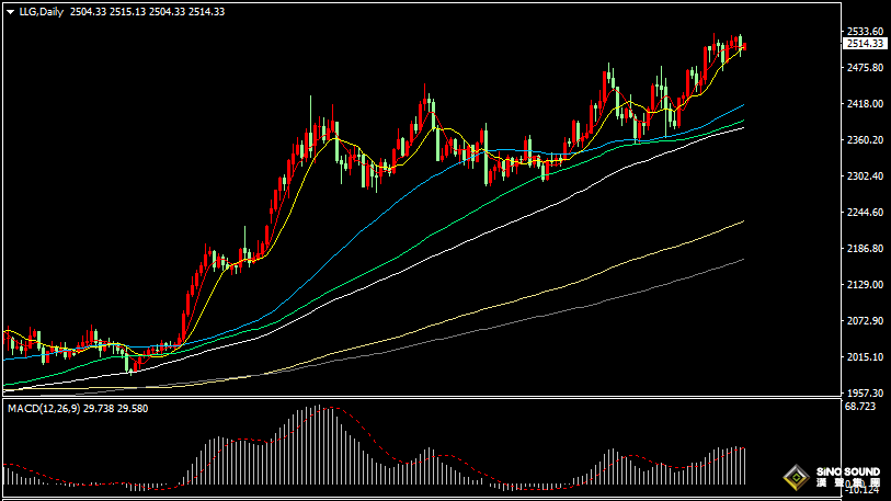 现货黄金日线图看,昨日金价高位回落并一度跌破10日均线,随后在2500关口附近争夺,金价终于守住2500并重新站上5日和10日均线。日线指标看,5日与10日均线形成胶结,MACD指标正动能柱小幅减少,RSI指标持续在60位置附近徘徊。
