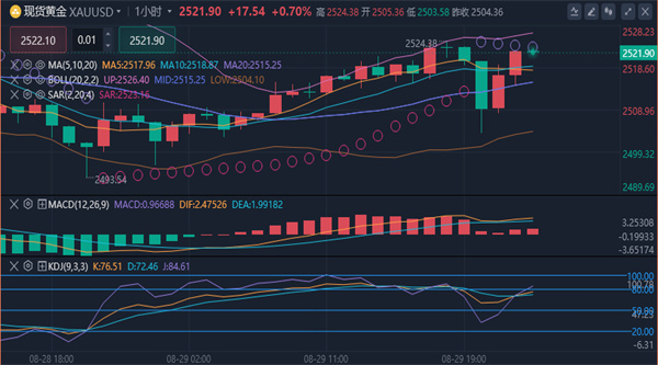 【黄金技术面分析】:黄金日线图来看,日K之中,随机指标顶背离钝化向下,偏空信号;然价位抗跌,难以形成暴跌;这里可能是拉高之后,主力杀跌。这样走势,基本上符合指标和形态;因为形态是新高没出,指标是看跌向下,要想兼顾形态和指标,只能是破顶新高之后,快速杀跌模式;4小时,BOLL收缩,目前收缩区间是2490-2528区间;小区间收缩,后续进一步选择方向;指标上,随机指标和MACD指标进入钝化状态,暂时信号不会很明确;今日支撑位置2493-2485-2470,这三个支撑,支撑附近做多;压力位置2530-2531,破位,则顺势跟进,不破,则看承压。综合来看,今日黄金短线操作思路上以回踩低多为主,反弹高空为辅,上方短期重点关注2530-2535一线阻力,下方短期重点关注2500-2495一线支撑。