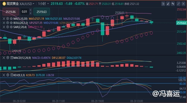 【黄金消息面分析】:美国第二季度GDP修正数据显示,经济增长速度达3%,高于此前预期的2.8%。此外,截至8月24日当周,美国初请失业金人数下降了2000人。在强劲的美国经济数据公布后。现货黄金一度跳水,触及2504美元低位,但因鲍威尔曾暗示美联储9月将降息的可能性,黄金“深V”反弹,最终收涨0.68%,报2521.00美元/盎司。