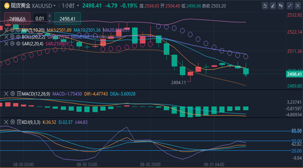 【黄金消息面分析】:周一(9月2日)亚市早盘,现货黄金在2500关口附近徘徊,目前交投于2503.77美元/盎司附近。金价周五下滑1%,在美国通胀数据符合预期后美元和美债收益率走强,金价盘中一度跌至2494.12美元/盎司,但由于美联储9月降息的可能性仍然存在,黄金仍录得月线涨幅,收报2403.29美元/盎司。