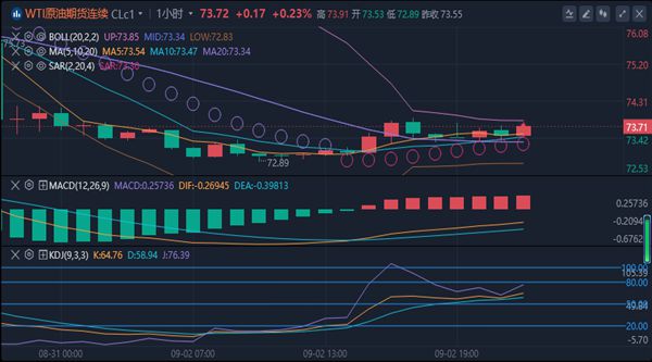 【原油消息面分析】:周一(9月2日)欧盘时段,美国原油期货周一继续下跌,市场对沙特阿拉伯可能减产以及欧佩克+产量预期增加做出反应。美国原油期货价格周一小幅下跌,盘中报73.51美元每桶,跌幅0.05%。上周,布伦特原油和西德克萨斯中质原油(WTI)分别下跌0.3%和1.7%。
