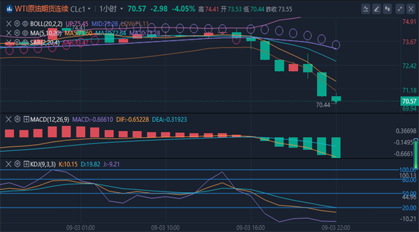 【原油消息面分析】:周二(9月3日)欧盘时段,油价继续面临下行压力,对需求疲软的担忧盖过了利比亚和中东供应中断的影响。原油期货价格走低,反映出尽管有一些有利因素,但市场仍面临看跌情绪。WTI原油盘中报72.47美元每桶,跌幅1.47%。