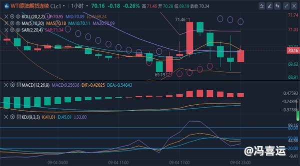 【原油技术面分析】:原油从日线图级别看,中期走势仍维持区间震荡整理节奏。72对油价存在有效支撑。原油在区间底部获得支撑重新反弹向上。K线连续连续两个交易日收大阳线,预示多头动能逐渐强势起来,预计中期走势仍将在区间内反弹向上运行。原油短线(1H)走势呈触底反弹节奏,油价仍受到均线系统的压制,短线客观趋势方向向下。从动能看,多空在相互胶着中,油价在底部有望形成次要震荡区间,预计日内原油保持底部低位调整节奏,仍以看空思路为主。综合来看,原油今日操作思路上以反弹高空为主,回踩低多为辅,上方短期关注71.5-72.0一线阻力,下方短期关注69.0-68.5一线支撑