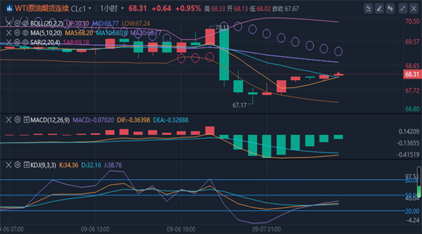 【原油技术面分析】:原油周五白天出现了窄幅震荡中,最低点在68.7美元之后,出现了反弹在70.0区域徘徊。原油日线级别上显示,油价在连续收阴之后出现了小十字星形态收盘,高价没有上破前高,依旧出现低位偏空形态中,如果上不去随时都可能回调的概率。4小时附图MACD红色柱缓慢的释放量能,快慢线也结出金叉,KDJ随机指标三轨处于超卖区域粘合,后续也将结金叉上行,周四和周五凌晨的低点都在68.7一线,短线关注该位置是否破位,不破可能出现一个反弹。原油处于一个低位震荡徘徊中,破位将有望延续。综合来看,原油今日以反弹高空为主,回踩低多为辅,上方短期关注69.5-70.0一线阻力,下方短期关注67.0-66.5一线支撑。