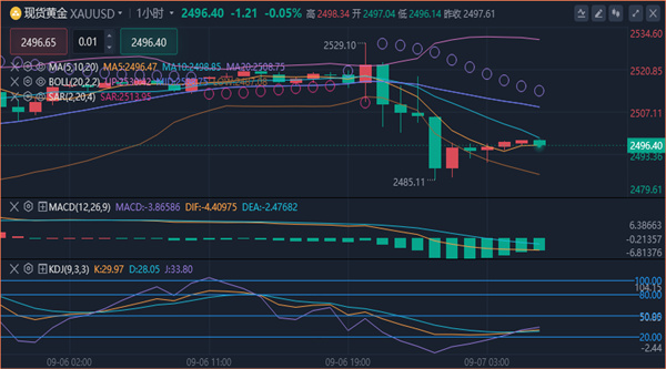 【黄金消息面分析】:周一(9月9日)亚市早盘,现货黄金窄幅震荡,目前交投于2496.47美元/盎司附近。金价上周五冲高回落,因为非农新增就业人数不及预期,金价一度创近三周新高至2529.06美元/盎司附近,逼近历史高点,但很快回吐涨幅,因为失业率下降,而且美联储“三号人物”并未向市场释放降息50个基点的信号,令市场对美联储本月晚些时候降息的幅度产生怀疑。