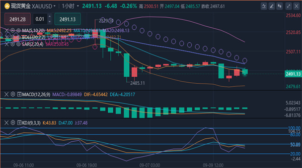 【黄金技术面分析】:4小时图,上周五美盘时段公布的失业率数据不及预期,金价虽一度接近2530的前期阻力,但未能持续上攻,反而小幅回落至2490下方。当前短期均线组已形成空头排列,MACD虽处死叉但仍在0轴上方,能量柱有所缩减,布林带开口。从技术指标来看,黄金短期偏向弱势。不过,近期金价在2530至2470区间内大幅波动,并没有一个很明显的方向,在此区间未破之前,综合来看,黄金今日短线操作思路上反弹高空为主,回调低多为辅,上方短期重点关注2515-2520一线阻力,下方短期重点关注2485-2480一线支撑。
