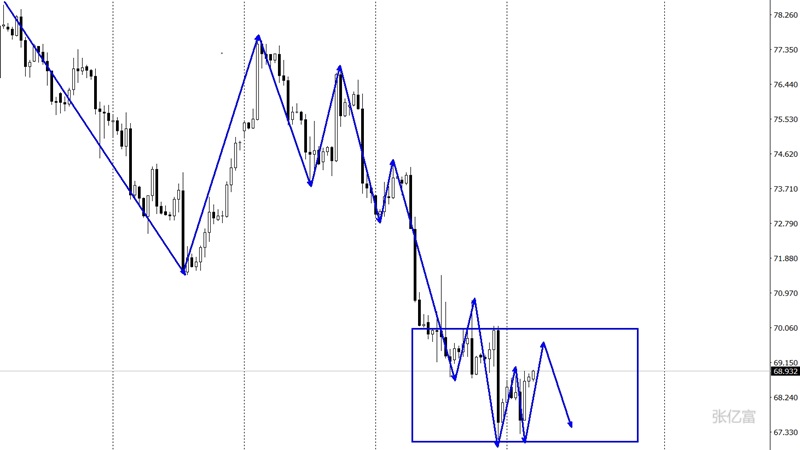原油今日出现了震荡下破走势,在69.0一线遇阻后,出现了空头持续回落,最低点触及65.8美元水平徘徊。日线级别收录一根小阳线,但是没有出现突破前高压力,只能说一点调整,依旧偏空运行,4小时附图指标MACD金叉良好,红色量能柱处于放量阶段,KDJ随机指标同步死叉下行中,但需要留意一点,RSI相对强弱指标处于超买区域,表明了油价处于一个比较弱势的行情中。综合以上分析,张亿富认为:原油处于偏空运行中,后市依旧有下跌概率,今日操作上考虑反弹做空为主,上方关注68.5-79.5美元阻力,下方关注65.5-65.0美元支撑。今日原油实盘在68.4-68.8一带布局空单,获利在67.0一线,最低点给到了65.8美元。