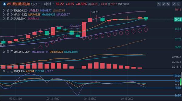 【原油消息面分析】:周五(9月13日)亚市盘初,国际油价在近一周高位徘徊,美原油目前交投于69.38美元/桶附近。油价周四上涨约2%,生产商评估美国墨西哥湾石油产出受到的影响,此前飓风弗朗辛肆虐近海产油区,随后降级为热带风暴。