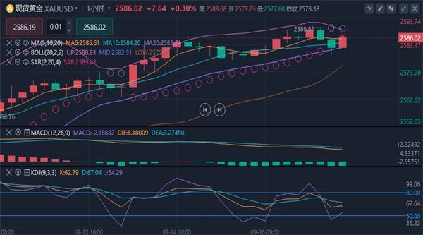 【黄金技术面分析】:技术面上来看上周五日线收了一根中阳柱,布林带即将开口,KDJ指标金叉放量,目前来看大趋势偏上,中线阶段性上行。价格如期震荡上行,短线预计回调修整后上行为主;黄金连阳不停逼空上攻,留意5均线2570支撑得失,若开盘走出修正,并回踩下坡2470,则有望修正至10均线2555一线;而这里企稳就是最佳看涨位置,1小时级别黄金冲击2585一线位置,短线受阻调整,下方关注顶底转换2565-2560一线支撑,若不破将会继续走强。综合来看,黄金今日操作思路上回调做多为主,反弹做空为辅,上方短期重点关注2595-2600一线阻力,下方短期重点关注2570-2565一线支撑。