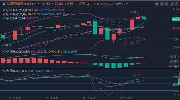 【原油消息面分析】:周二(9月17日)欧盘时段,WTI原油价格在下探至69.61美元的地点后V形反弹。盘中报70.19美元每桶,涨幅0.14%。由于来自全球供需因素的喜忧参半的信号,石油市场仍面临压力,投资者密切关注飓风“弗朗辛”过后美国的产量担忧,以及美联储即将做出的利率决定。