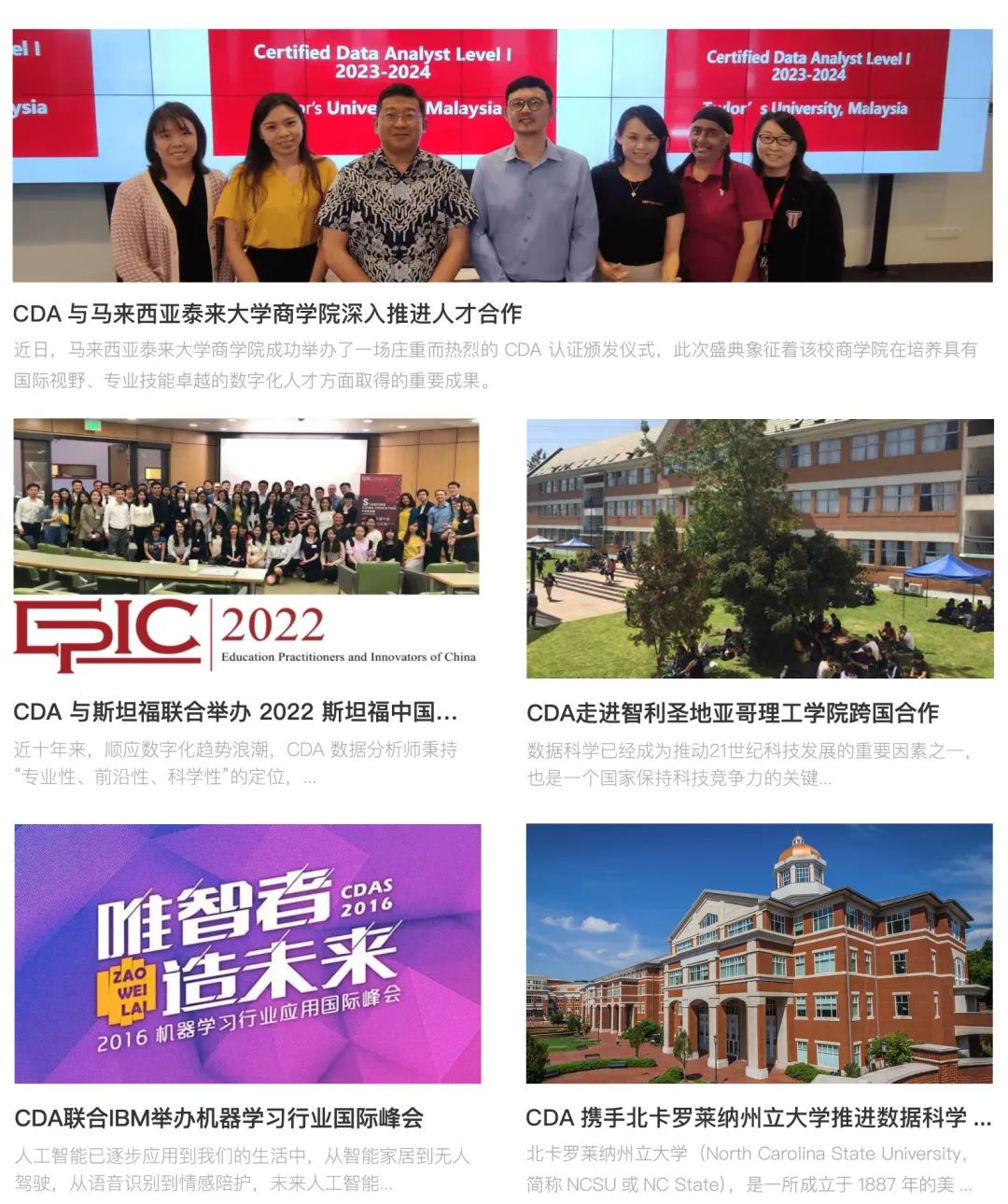 CDA不仅在中国拥有广泛的业务,还积极在全球范围内积极开拓,迈向更加宽广的国际化道路。CDA与众多知名国外企业、大学和机构,如Taylor's University、Stanford、UTFSM、CDMS、Oracle、IBM、Big Data University、Pearson VUE、Meritdata、TalkingData、CDA INSTITUTE、Yonghong Tech以及CASICloud Deutschland GmbH等,共同携手,深入推动数据科学研究的繁荣与人才发展。
