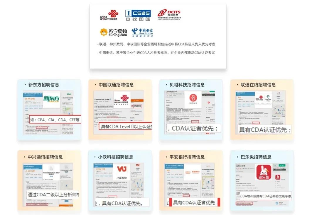 众多企业在招聘数据分析师时,在招聘要求里列入CDA持证人优先,充分体现了CDA认证在行业内的影响力和认可度。比如联通、神州数码、中软国际等企业招聘职位描述中将CDA持证人列入优先考虑;中国电信、苏宁等企业引进CDA人才参考标准,在企业内部推动CDA认证考试。