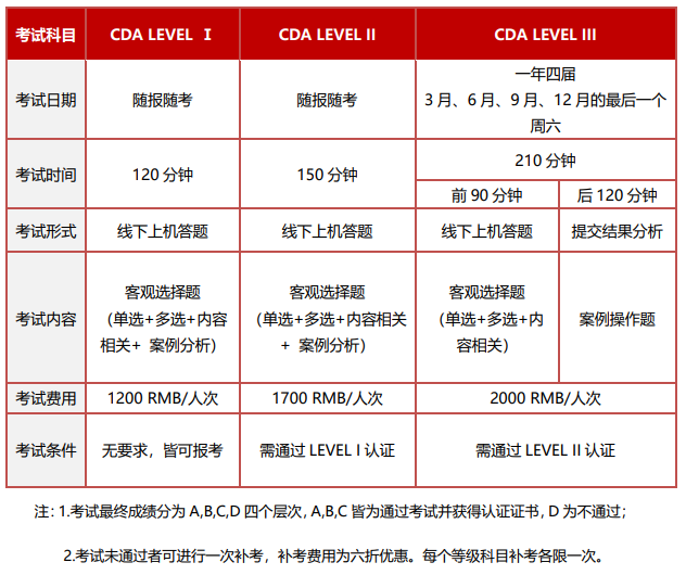 简单介绍一下CDA考试安排,考试分为三级,LEVEL I和LEVEL II随报随考,LEVEL III则在每年3月、6月、9月和12月的最后一个周六进行。考试形式为线上或线下机考。考试成绩分为四档,通过者可获得认证证书。
