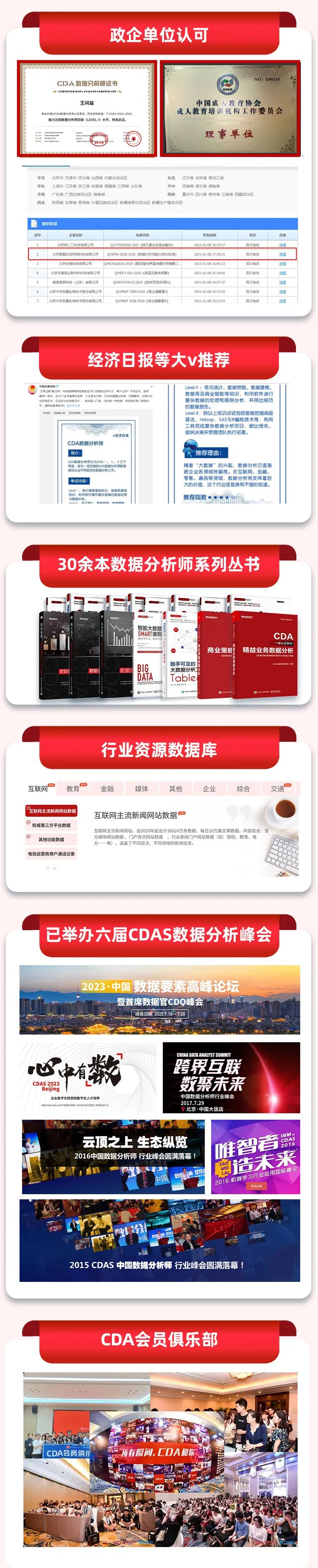 CDA已推出30余本数据分析师系列丛书,市场销量高达数十万册。同时,CDA还构建了涵盖互联网、金融、医疗、教育、媒体等多个行业的庞大数据资源库,实现个人与企业会员间的数据共享。此外,还已成功举办六届CDAS中国数据分析师行业峰会,每届均吸引超过3000名行业精英参与,全球CDA俱乐部会员已突破数十万。