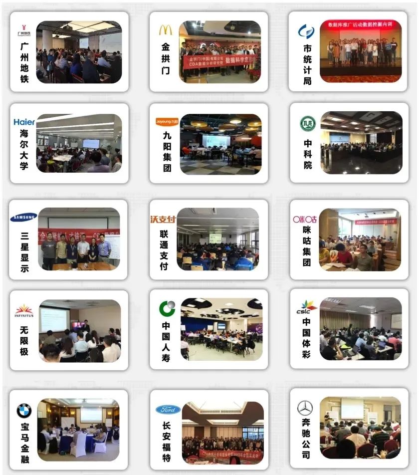 CDA认证已得到越来越多企业的认可与引进,成为企业的人才评价标准,包括中国移动、中国联通、中国电信、招商银行、工商银行、渣打银行、中国人寿、苏宁集团总部、国家电网、奔驰、宝马、咪咕集团、重庆统计局等。