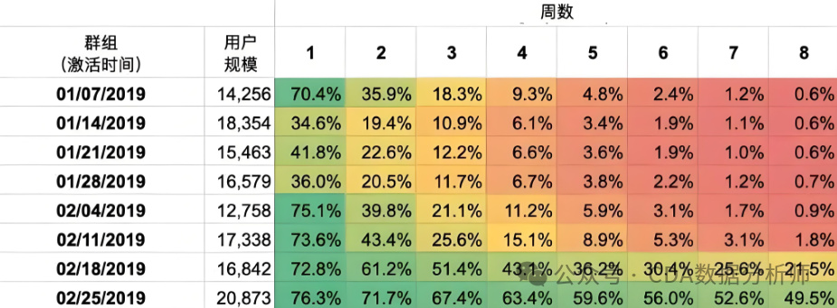 同期群分析(Cohort Analysis)是对比不同同期群之间的相同指标,如留存率、活跃度等,从而分析用户行为的变化和产品效果。
