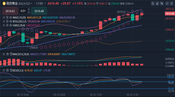 【黄金消息面分析】:周五(9月20日),现货黄金价格逼近2620美元/盎司的历史高点,因市场普遍预期全球主要央行将跟随美联储放松政策,并在未来数月内大幅降息。截至发稿时,现货黄金报2616.26美元/盎司,日内上涨1.15%。