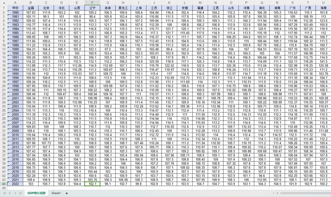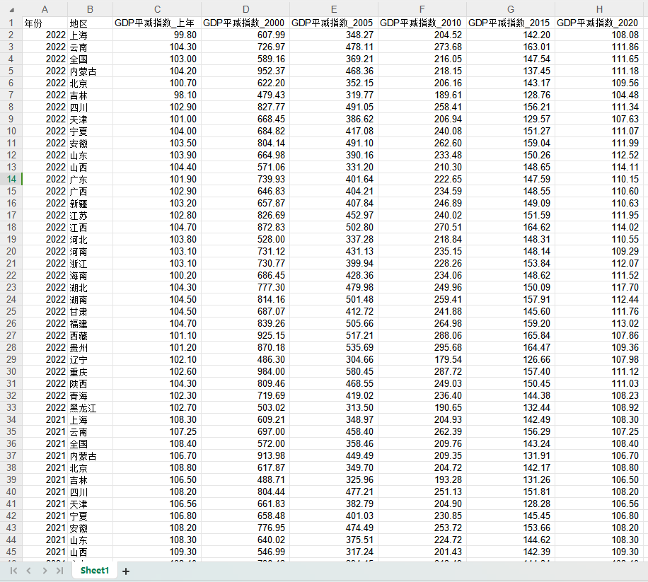 今天给大家带来一份GDP平减指数数据:中国各省市GDP平减指数(1980-2022年)