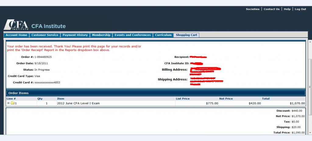 6.填写地址,这个地址会是邮寄给你CFA官方教材的,请认真填写,UPS送货(一般10个工作日到)。