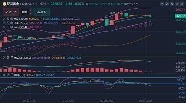 【黄金消息面分析】:周一(9月23日)亚市早盘,现货黄金在历史高位附近窄幅震荡,目前交投于2620.81美元/盎司附近。金价上周五首次突破2600美元大关,并一度刷新历史高点至2625.61美元/盎司,收报2621.99美元/盎司,