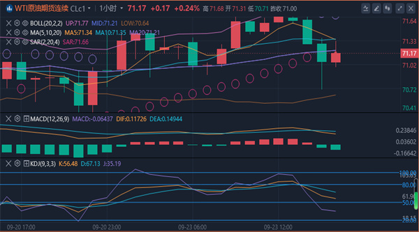 【原油消息面分析】:周一(9月23日),国际油价在中东局势升级与美联储降息预期的双重影响下继续上涨。布伦特11月原油期货价格上涨0.22美元,或0.3%,报每桶74.71美元;美国WTI 11月原油期货价格上涨0.26美元,或0.4%,报每桶71.26美元。