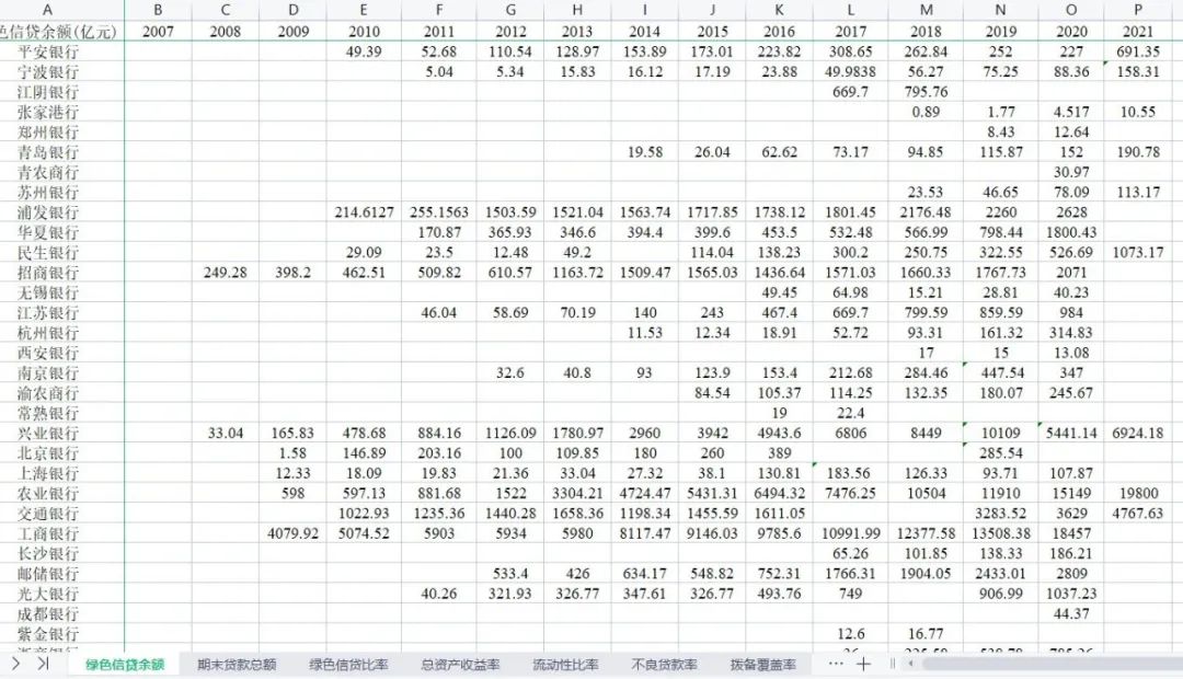 2、数据内容:37家上市银行主要数据包含绿色信贷余额 流动性比例(率) 资本充足率等,2007-2021年年度数据。
