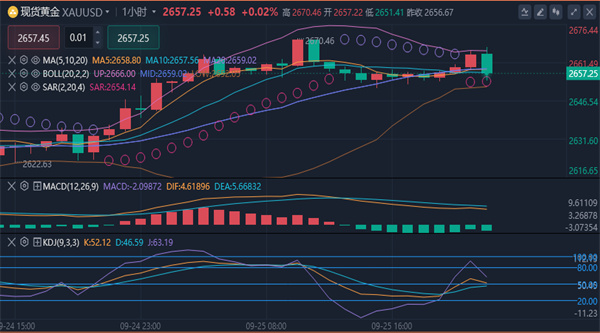 【黄金消息面分析】:周三(9月25日)欧盘时段,金价触及历史新高,受美联储再次大幅降息的预期和地缘政治紧张局势加剧的推动。金价一度达到每盎司2670.45美元,随后小幅回落,尽管市场对近期回调的猜测越来越多,但整体上行趋势仍保持不变。近期高点与50日移动均线(2641.04美元)之间的差距不断扩大,引发了对潜在下行压力的担忧。