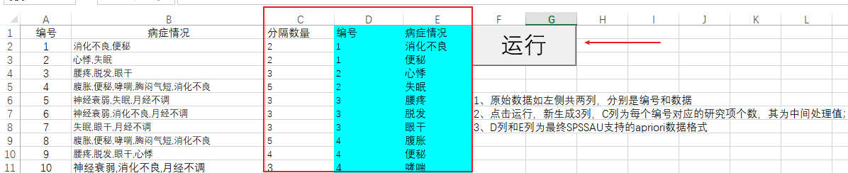 首先下载‘apriori_spssau_dataformat_trans.xlsm’这个EXCEL宏文件,如果打开后EXCEL提示有代码运行则需要同意它。接着将数据A和B列整理好,此时点击‘运行’按钮,并且输入B列涉及的分隔符(本案例为英文逗号,当然也可以是其它的分隔符号比如斜杠等),即可得到C、D和E共3列数据。C列标识分隔数量,即比如编号为1的病人共有2种病症,编号为2的病人也有2种病症,其用于检验数据使用。D列和E列为最终有效的数据格式,将该2列复制放到新的EXCEL文件中,然后上传到SPSSAU中进行分析即可。