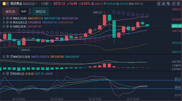 【黄金技术面分析】:目前已经临近9月底,但是现在的黄金月线依旧在轨外运行,而周线和日线也均在轨外运行。我们需要注意进轨回撤的风险,我们在对照历史牛市行情见顶均是加速上涨后快速回撤。昨日晚盘虽然加速上涨,但是今日目前还未快速大幅回撤,所以说2670有顶的可能,但是目前还无法确定,重点还需要看是否压制回撤跌破2630一线,跌破2630一线才有希望。综合来看,今日黄金短线操作思路上以回调做多为主,反弹高空为辅,上方短期重点关注2680-2685一线阻力,下方短期重点关注2655-2650一线支撑。