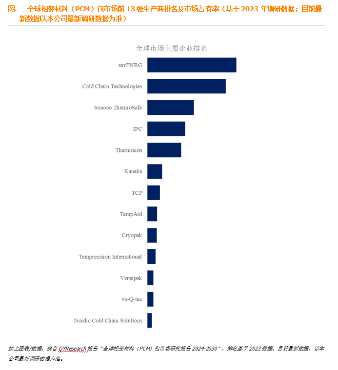 根据QYResearch头部企业研究中心调研,全球范围内相变材料(PCM)包生产商主要包括savENRG、Cold Chain Technologies、Sonoco ThermoSafe、IPC、Thermocon、Kaneka、TCP、TempAid、Cryopak、Temprecision International等。2023年,全球前五大厂商占有大约34.9%的市场份额。
