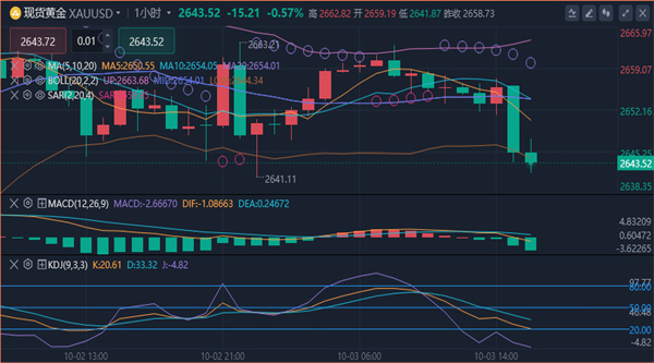 【黄金消息面分析】:周四(10月3日)亚市盘中,现货黄金保持稳定,目前金价交投在2657美元/盎司附近。周三纽约交易时段,现货黄金剧烈波动。强于预期的美国ADP数据出炉后美元走强,金价一度大跌至2640.91美元/盎司;但受中东紧张局势影响,金价自低点急剧反弹,收盘位于2658.44美元/盎司。