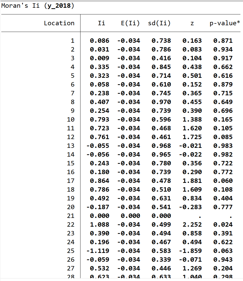 构造经济空间权重矩阵,进行局部莫兰指数检验莫兰指数检验结果: