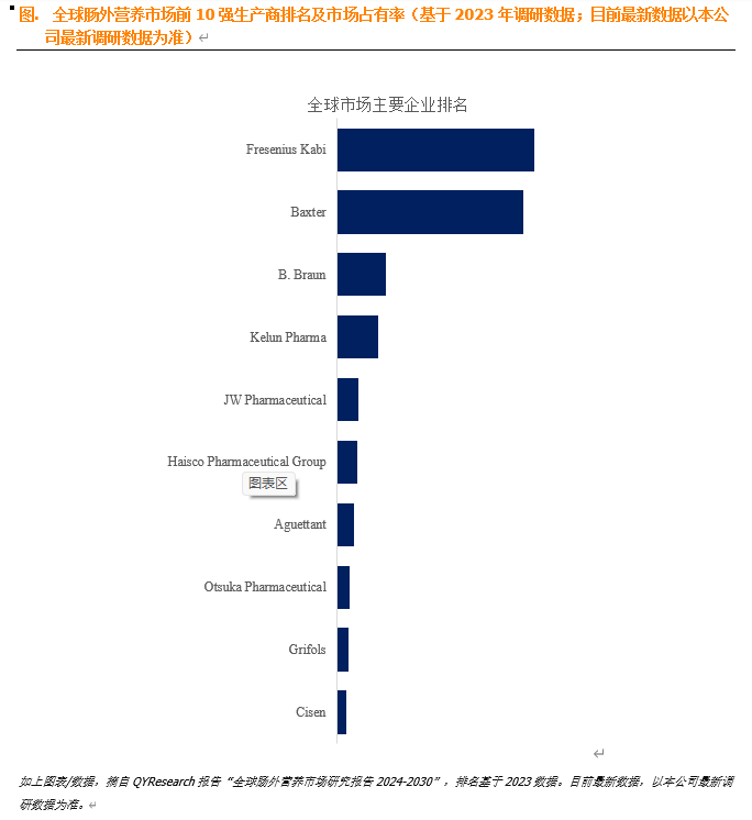 肠外营养行业作为医疗领域的重要分支,主要服务于无法通过口服摄取足够营养的患者,如重症监护、癌症治疗、胃肠道疾病等患者。当前,全球肠外营养市场主要由几家大型企业主导,如Fresenius Kabi、Baxter、B. Braun等,这些企业凭借其技术实力、品牌影响力以及完善的市场渠道,占据了市场的较大份额。