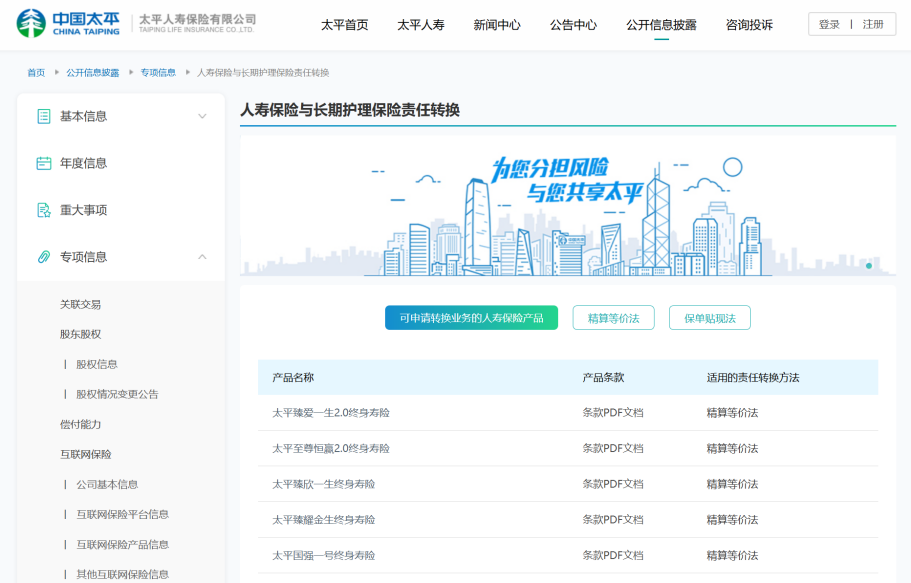 图:太平人寿“人寿保险与长期护理保险责任转换”信息披露专栏