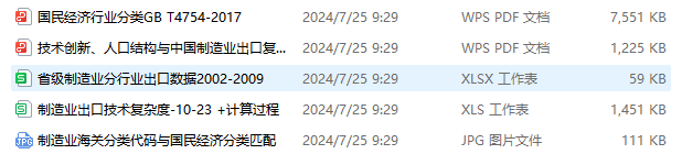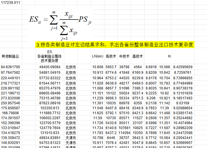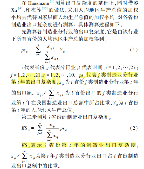 参考C刊《软科学》张艾莉(2019)老师研究的做法,,采用人均地区生产总值的加权平均去代替国家层面人均生产总值的加权平均,对各省份制造业出口复杂度进行测算。具体测算过程如下:先测算各制造业分行业的出口复杂度,它是由该行业下所有省份的人均地区生产总值加权得到,第二步测算i省份的制造业出口复杂度。