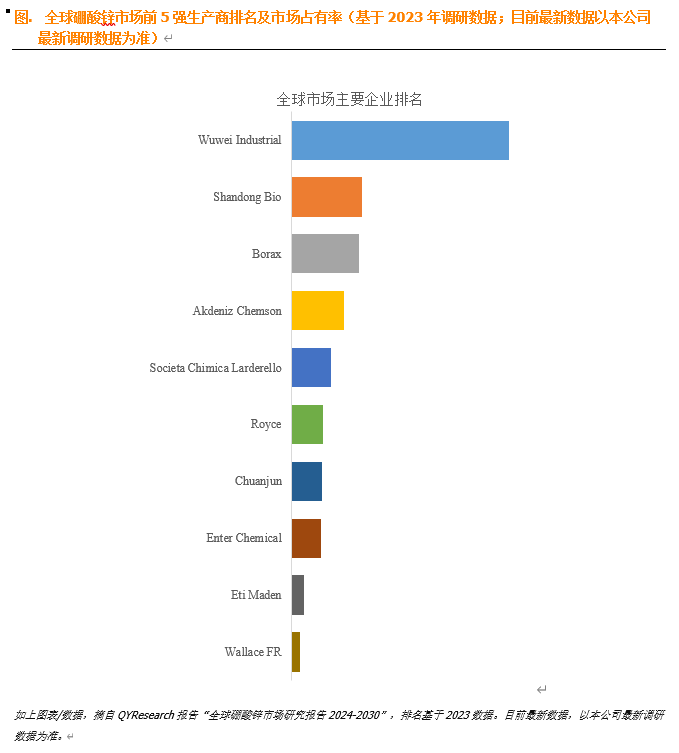 硼酸锌生产商可以通过市场拓展,特别是向新兴市场和发展中国家拓展,来寻求新的增长点。根据QYResearch头部企业研究中心调研,全球范围内硼酸锌生产商主要包括Wuwei Industrial、Shandong Bio、Borax、Akdeniz Chemson、Societa Chimica Larderello、Royce、Chuanjun、Enter Chemical、Eti Maden、Wallace FR等。2023年,全球前五大厂商占有大约68.0%的市场份额。