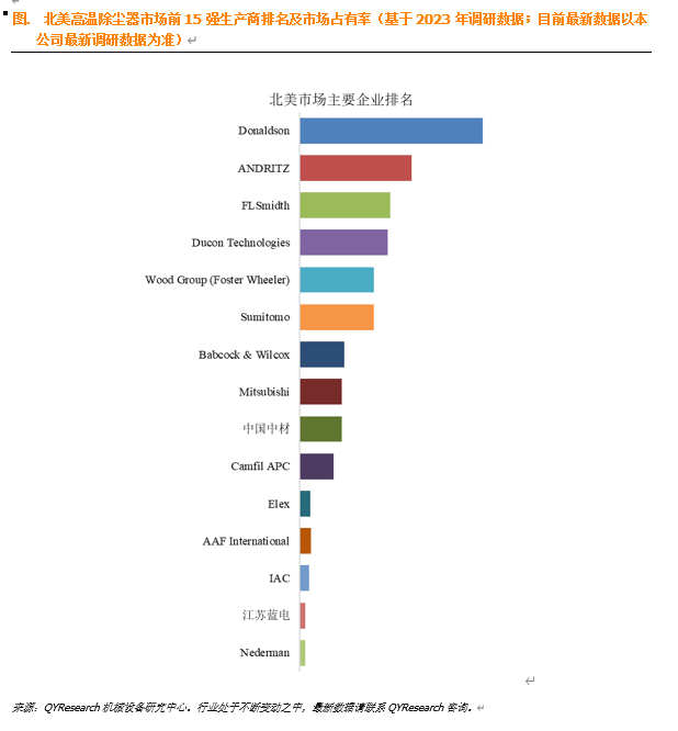 北美范围内,高温除尘器主要生产商包括Donaldson、ANDRITZ、FLSmidth、Ducon Technologies、Wood Group (Foster Wheeler)等,其中前五大厂商占有大约26.03%的市场份额。