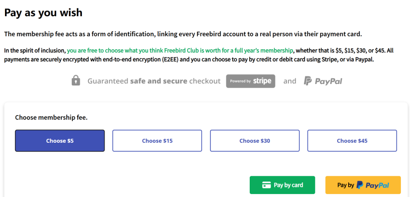基本信息填写好后,老人需要缴纳会员费。在会员费的设计上,Freebird采取了灵活选择制。用户可以选择5、15、30或者45美元,缴纳成功后将获取平台一整年的会员使用资格。