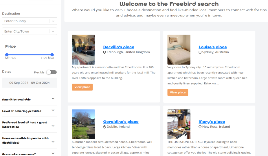 老年出租方是拥有房产并有出租意愿的人,他们或想通过租赁赚钱,或想结交更多新朋友。成为Freebird会员后,房东可以在网站上创建一个房源,添加物业详细信息,并设置自己的房价、入住、退房时间等。