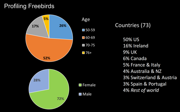 统计显示,在Freebird的现有会员中,60-69岁群体占比最大,为52%;其次是50-59岁,为26%;也有部分76+老人加入平台。这些会员来自全球73个国家,有16%爱尔兰本地人,还有50%的美国老年人及9%的英国银发族。