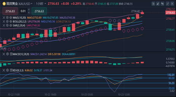 【黄金消息面分析】:周二(10月22日),现货金上涨1%,以历史纪录高位每盎司2,748.38美元收盘。黄金周二攀升1%,创下历史新高,因美国大选的不确定性和中东战争等因素刺激了避险需求,加上对进一步放宽货币政策的预期放大了金价升势