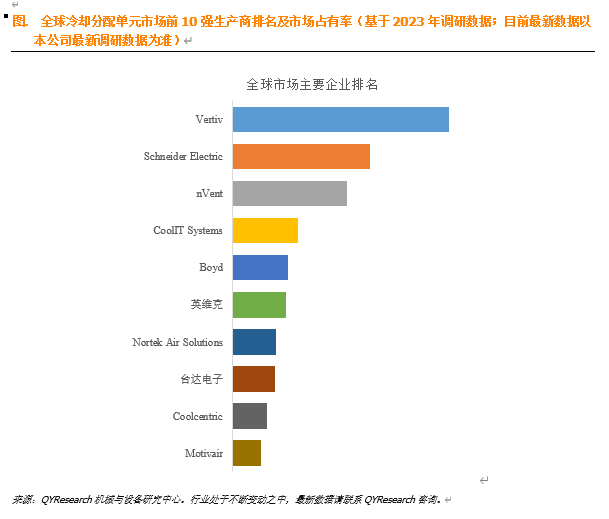 全球范围内,冷却分配单元主要生产商包括Vertiv、Schneider Electric、nVent、CoolIT Systems和Boyd等,其中前五大厂商占有大约63%的市场份额。