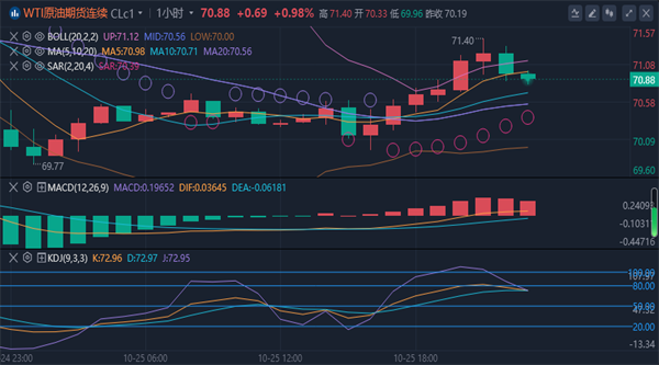 【原油技术面分析】:日线昨日带有上下影线的阴柱贯穿中轨和均线粘合点,代表价格还是震荡走势。而目前日线指标macd死叉放量,灵动指标sto向下代表日线震荡偏弱。短期关注均线MA60和中轨粘合压制71.6一线。4小时当前macd死叉放量,灵动指标sto快速向下到超卖区域附近代表4小时目前震荡偏弱。短期关注昨日低点69.7一线支撑。小时线目前macd死叉缩量粘合,灵动指标sto快速向下修复,代表1小时线目前向下试探昨日低点的过程。如果不能下破可能伴随震荡反弹。综合来看,原油今日操作思路上以反弹高空为主,回踩低多为辅,上方短期关注71.5-72.0一线阻力,下方短期关注69.5-69.0一线支撑。