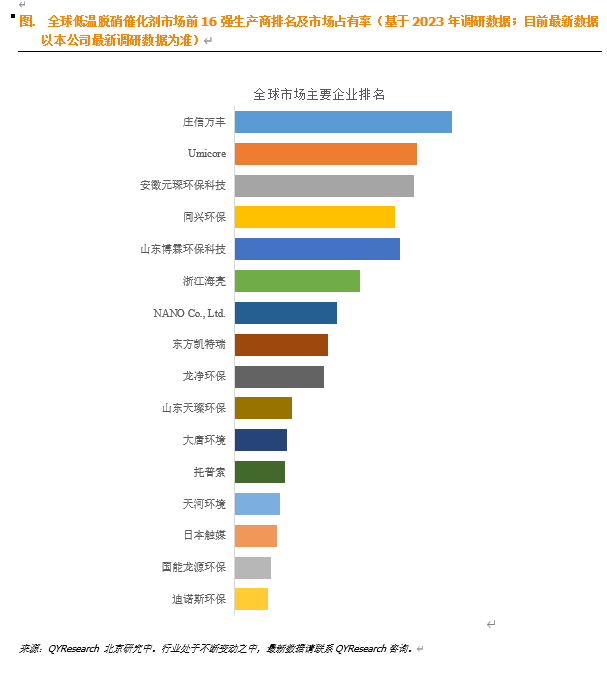 根据QYResearch头部企业研究中心调研,全球范围内低温脱硝催化剂生产商主要包括庄信万丰、Umicore、安徽元琛环保科技、同兴环保、山东博霖环保科技等。2023年,全球前五大厂商占有大约45.0%的市场份额。
