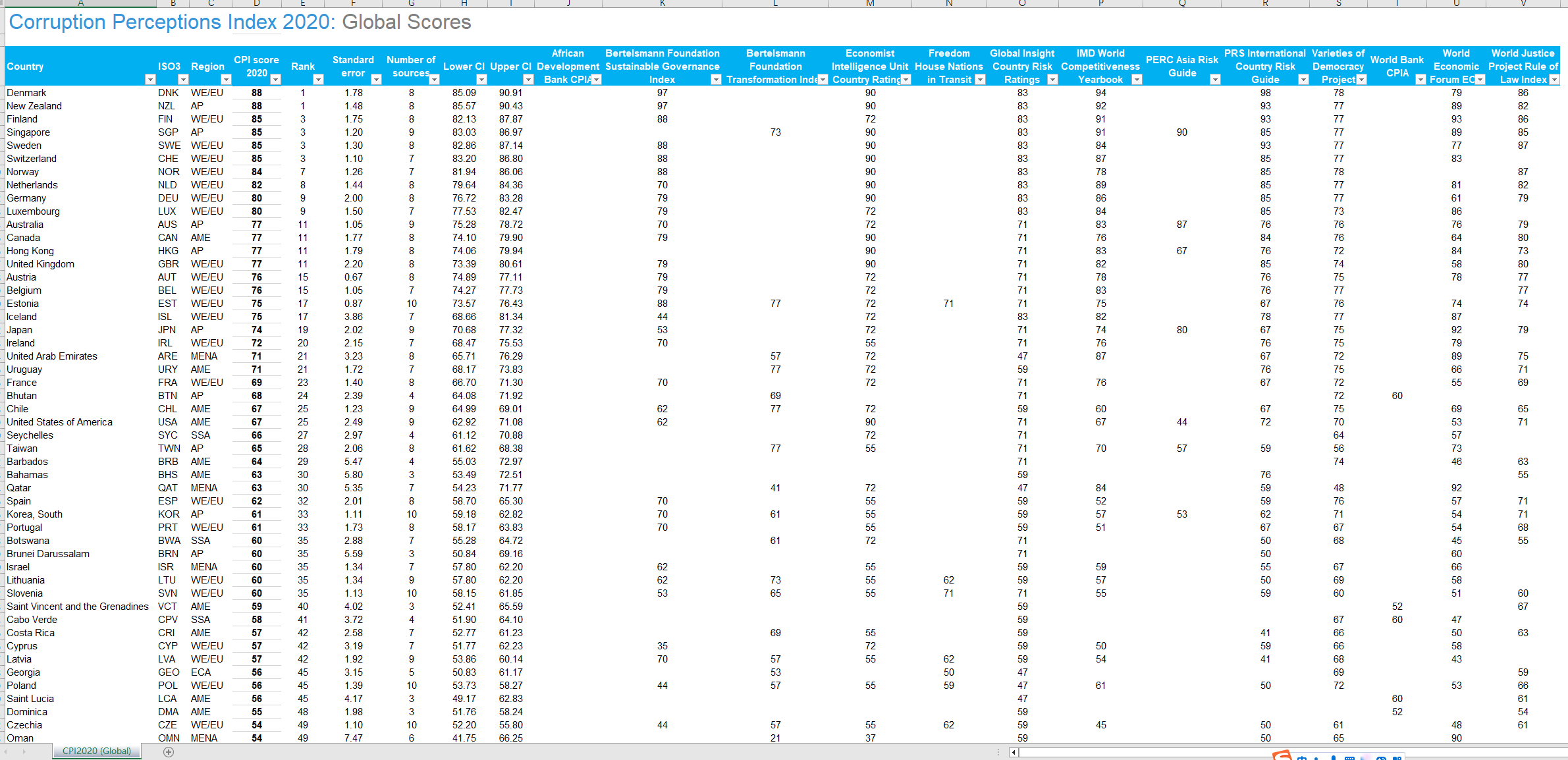 世界各国清廉指数(CPI)是由透明国际(Transparency International)自1995年起每年发布的评估报告,它基于各国商人、学者及国情分析师对各国公务人员与政治人物贪腐程度的评价,对全球各国的腐败状况进行主观感知程度的评估及排名。清廉指数分数越高表示腐败程度越低,即越清廉;反之,分数越低表示腐败程度越高。