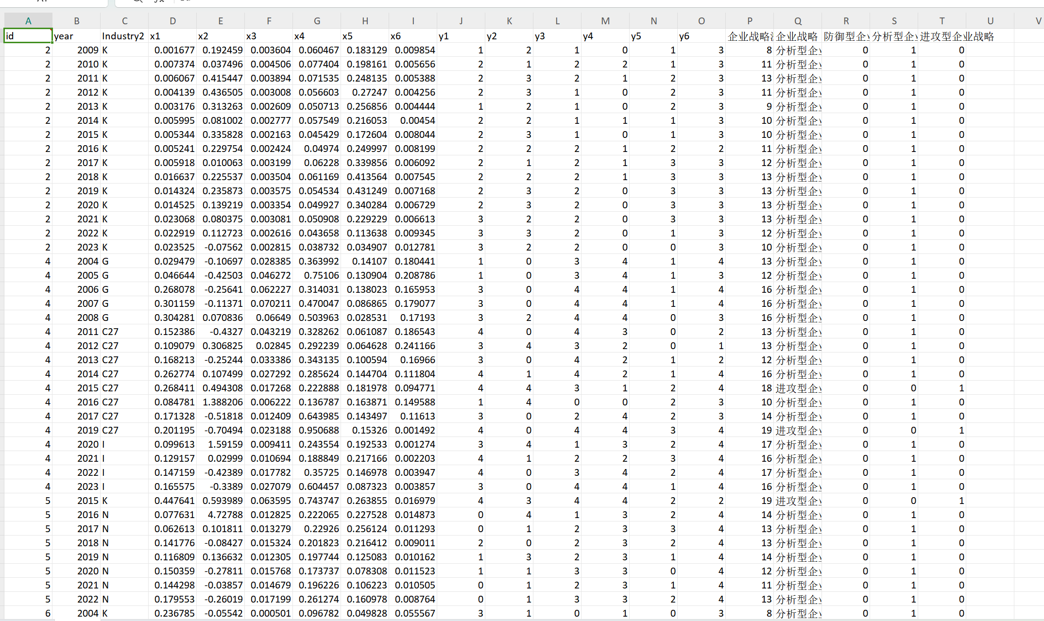 ✅对于上述六个指标,首先计算它们过去五年的平均值,而后按照行业—年度将各指标从小到大排序并且平均分为五组。对于变量(1)至(5),给最小组赋值为0分,次小组赋值为1分,依此类推,最大组赋值为4分 ;对于变量(6),给最小组赋值为4分,次小组赋值为3分,依此类推,最大组赋值为0分。最后,将每一个公司—年度样本的六个维度的得分相加,便可得到取值范围在 0-24 分之间的分值,定义其为战略激进度。分值越高,表明公司战略越激进。