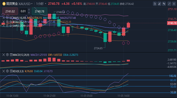 【黄金消息面分析】:周二(11月5日)亚市早盘,现货黄金延续上一交易日的窄幅震荡走势,目前交投于2734.64美元/盎司附近。金价周一接近收平,收报2736.48美元/盎司,投资者还密切关注本周晚些时候的美联储政策会议。
